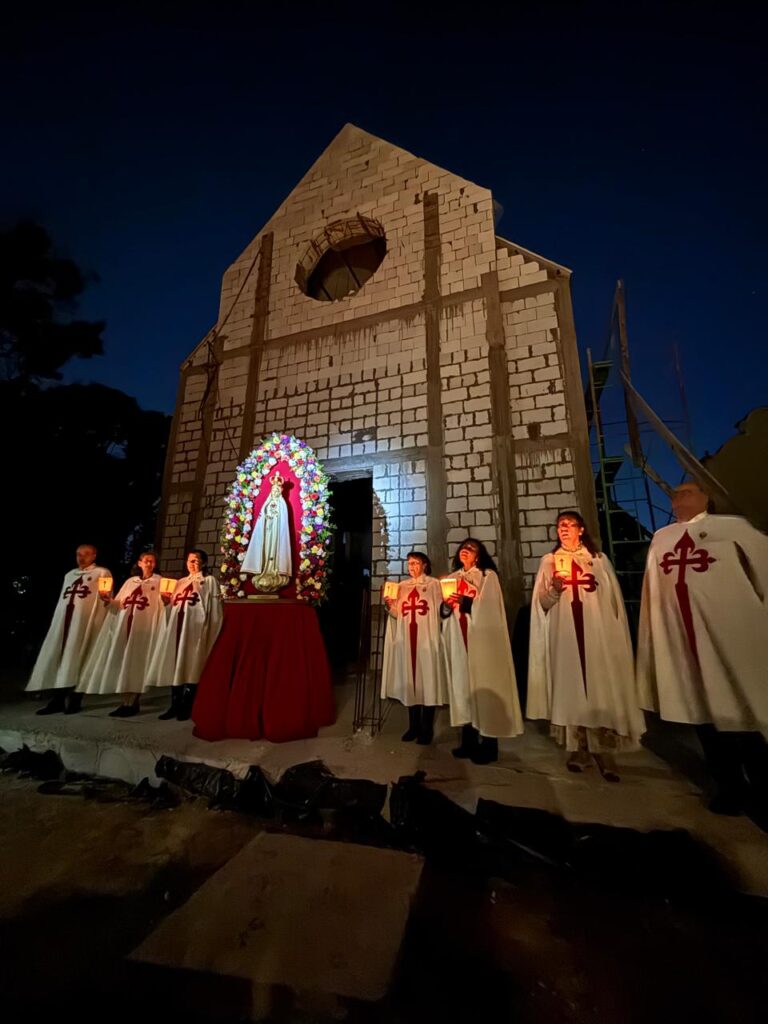 Al terminar el Rosario, los juegos artificiales iluminaron la construcción que estamos realizando, simbolizando la alegría de ser hijos de aquella que es nuestra Reina y Madre. Familias y amigos, con los corazones llenos de gozo, unían sus voces en una aclamación unánime: “¡Que viva la Virgen!”